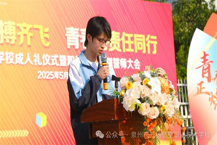“泉州市金牌工人”、泉州市職業(yè)技能競賽智能飛行器裝調(diào)檢修銅牌獲得者曾子進(jìn)老師作為教師代表發(fā)言,勉勵學(xué)子珍惜時(shí)光、勤勉學(xué)習(xí),為夢想筑牢基石。